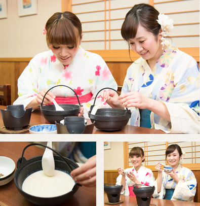 片山津温泉の源泉は、ナトリウム、カルシウム、ミネラルを多く含んだちょっとしょっぱい温泉。この源泉をにがり代わりに使って作るのが「源泉豆腐」体験です。どんな豆腐に仕上がるかはあなたの腕次第!きっと市販のものとは一味違う、手作りならではのふわふわ食感、素朴で深い味わいをお楽しみいただけるはずです。